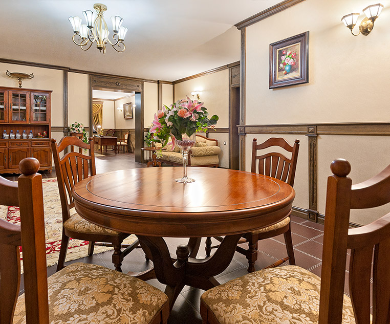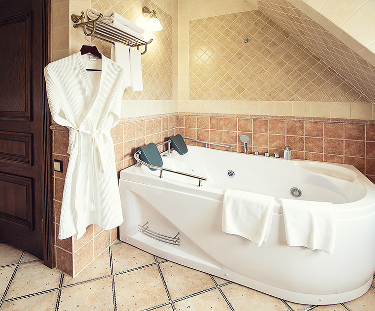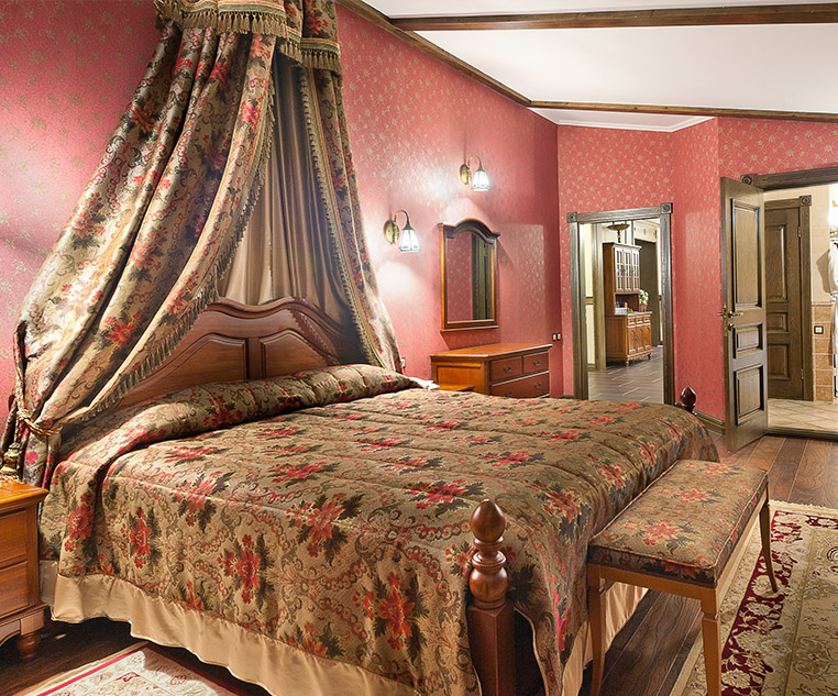 Две спальные комнаты выполнены в лучших традициях царских палат, большую кровать украшает балдахин из дорогих тканей, а шёлковые обои придают утончённость ансамблю королевского номера.