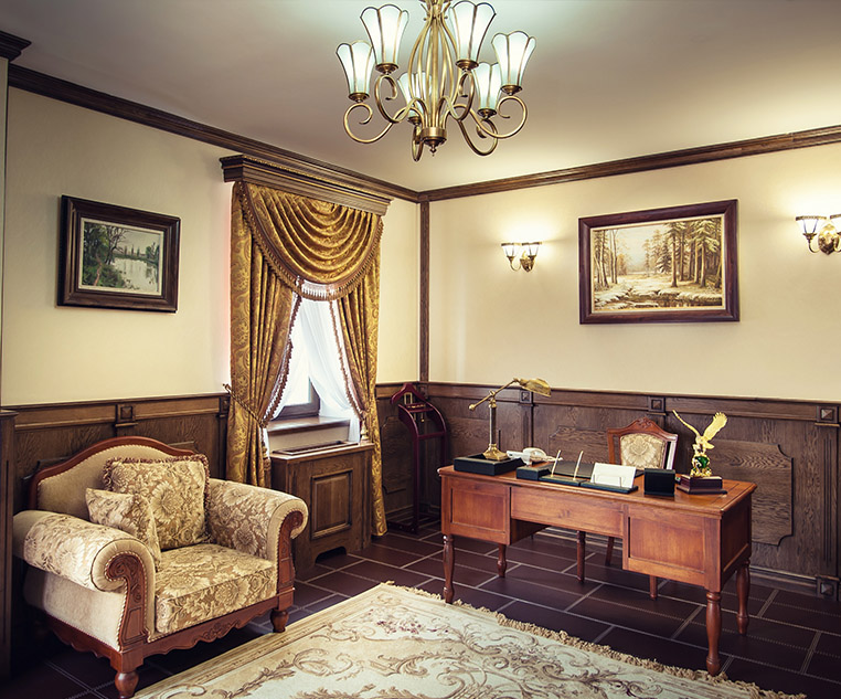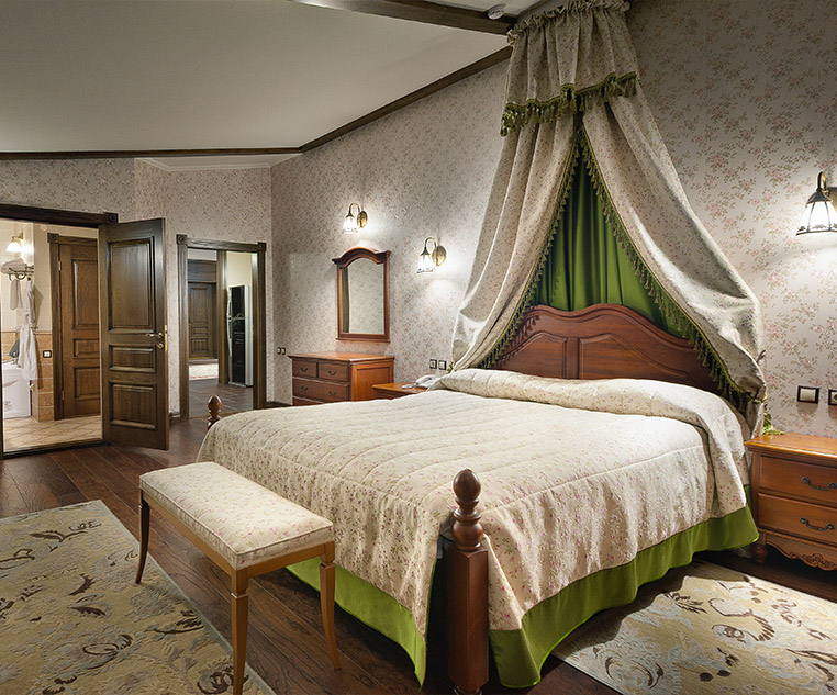 Две спальные комнаты выполнены в лучших традициях царских палат, большую кровать украшает балдахин из дорогих тканей, а шёлковые обои придают утончённость ансамблю королевского номера.