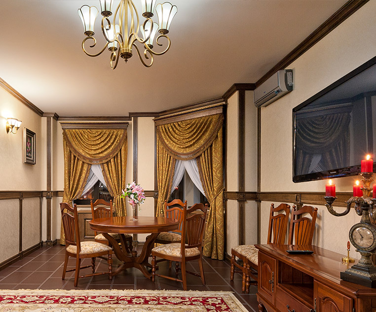 Роскошный двухместный номер, способный удивить даже самых искушенных гостей. Из его окон открывается величественная панорама Астаны. В интерьере использована изысканная отделка деревом, объемные шторы с ламбрекенами и мягкая мебель. Атмосфера королевского изобилия царит в большой гостиной. Изящная мебель из натурального высококачественного дерева, роскошные диваны, изысканный текстиль, отличная звукоизоляция, настенная плазменная панель, свечи, картины и цветы подарят наслаждение от пребывания в апартаментах.