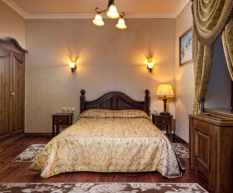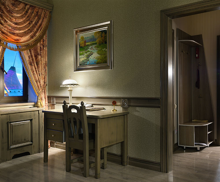 К услугам гостей респектабельные номера класса «ЛЮКС» с потрясающим видом на достопримечательности столицы. Каждый номер создан с учетом лучших традиций интерьеров в дворянских резиденциях, таких как особняки Юсуповых, Орловых, Волконских и др.