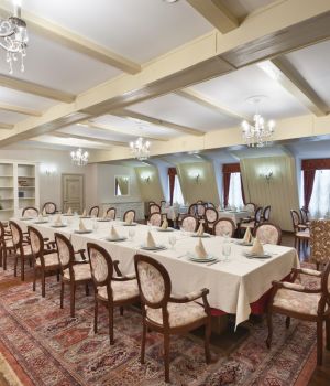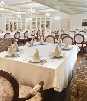 «Библиотечный» соседствует с конференц-залом, чем удобен для проведения бизнес-завтраков, кофе-брейков и деловых обедов. Дополнительные преимущества для гостей создают отдельный вход, позволяющий гостям пройти в зал конфиденциально, отдельные гардеробная и уборная комната.